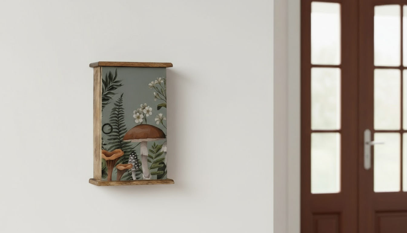 • Nyckelskåp i mangoträ med svampmotiv Nyckelskåp i mangoträ med svampmotiv
